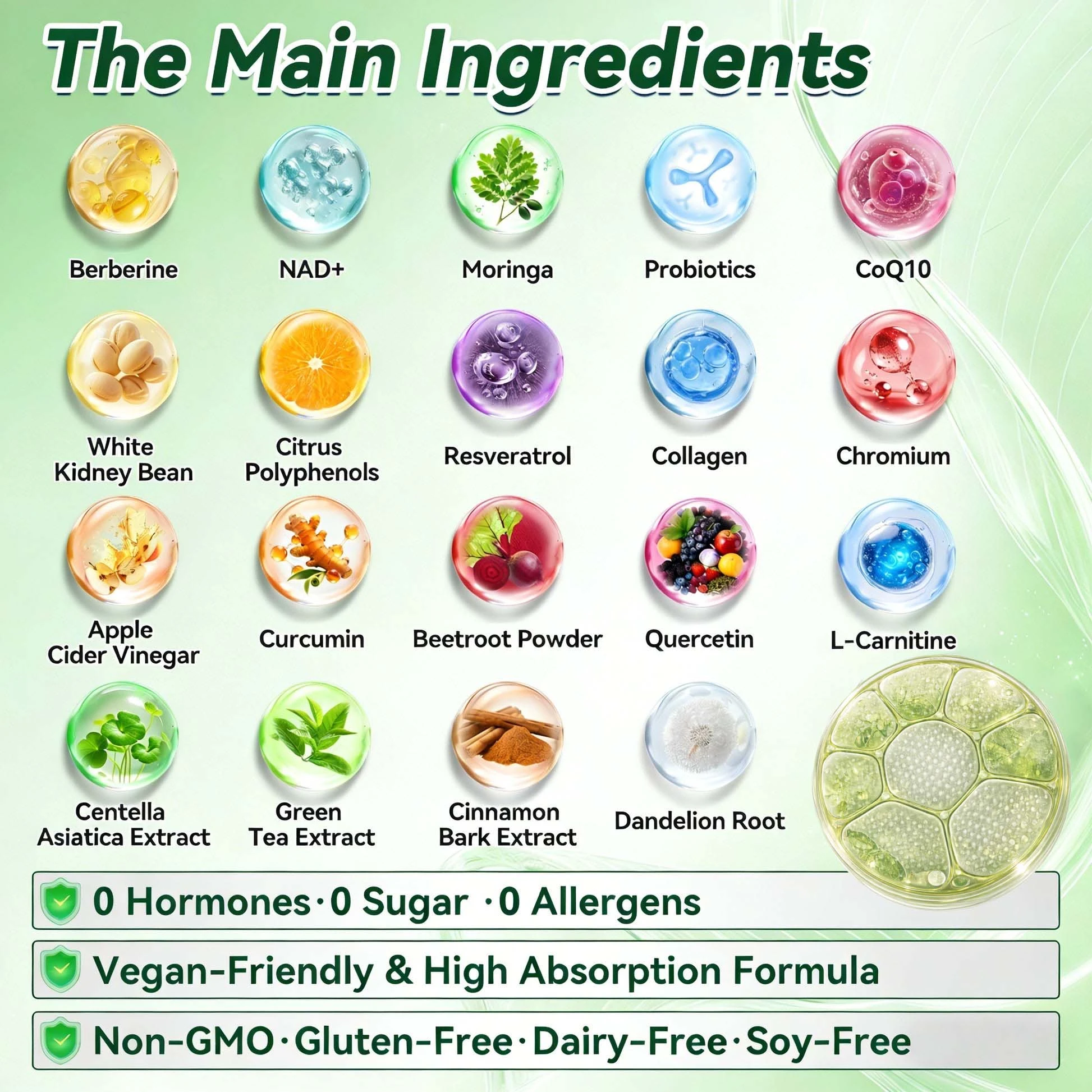Its advanced formula contains high concentrations of natural active ingredients such as ๐๐๐ซ๐ฏ๐ฒ๐ซ๐ข๐ง๐, moringa, which work synergistically to support blood sugar stabilization, appetite regulation, and fat metabolism, enabling a gradual and sustainable weight management process. NAD+ and collagen peptides help maintain skin firmness and elasticity during weight changes, allowing you to look and feel great while slimming down.