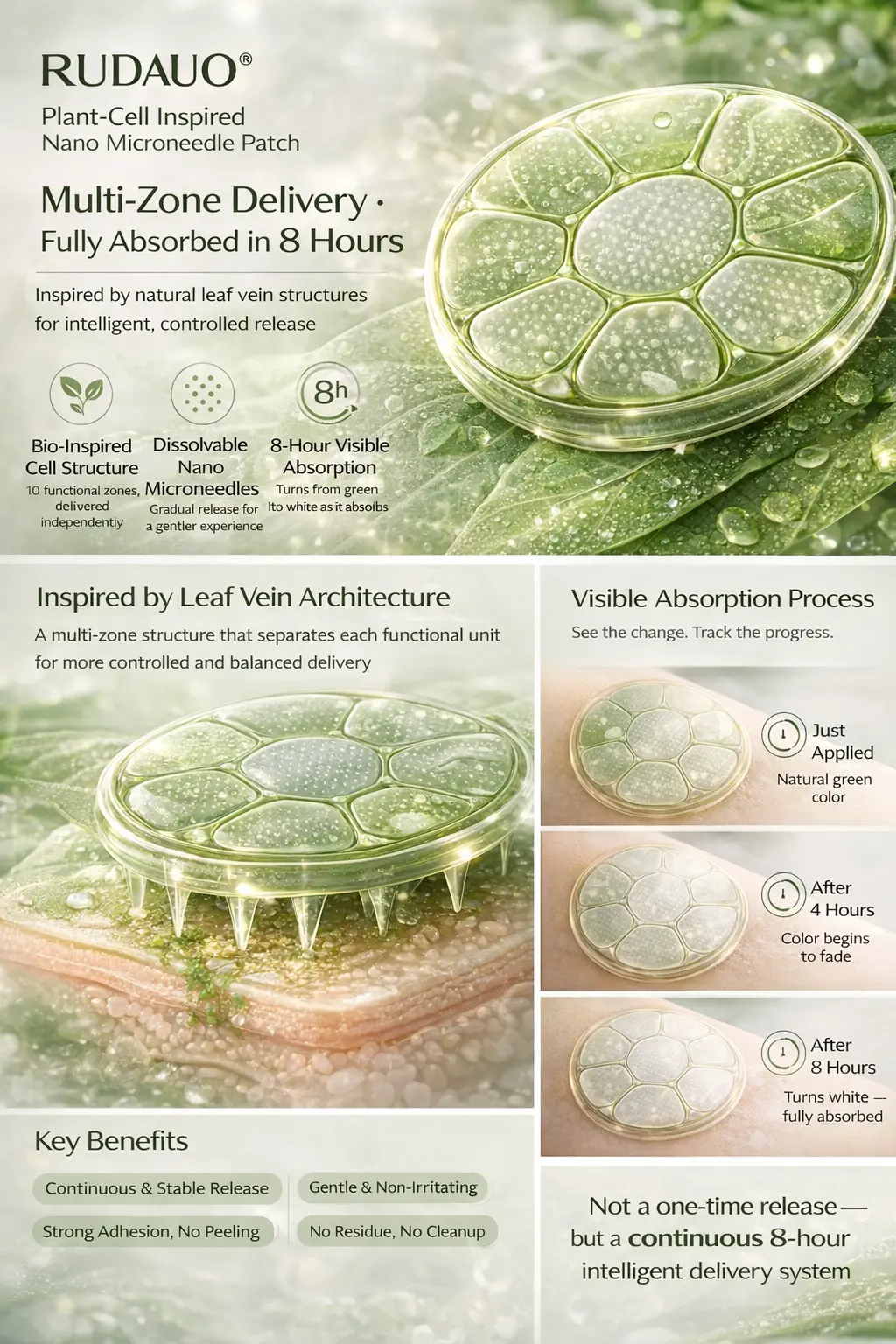 This product features a plant-cell inspired multi-zone structure, where each functional element is stored in its own micro-chamber rather than being mixed together. Through dissolvable nano microneedles, these elements are delivered gradually into the skin, allowing for a more controlled and balanced absorption process over time. As the patch works, it transitions from green to white โ providing a visible indication of the 8-hour absorption cycle.