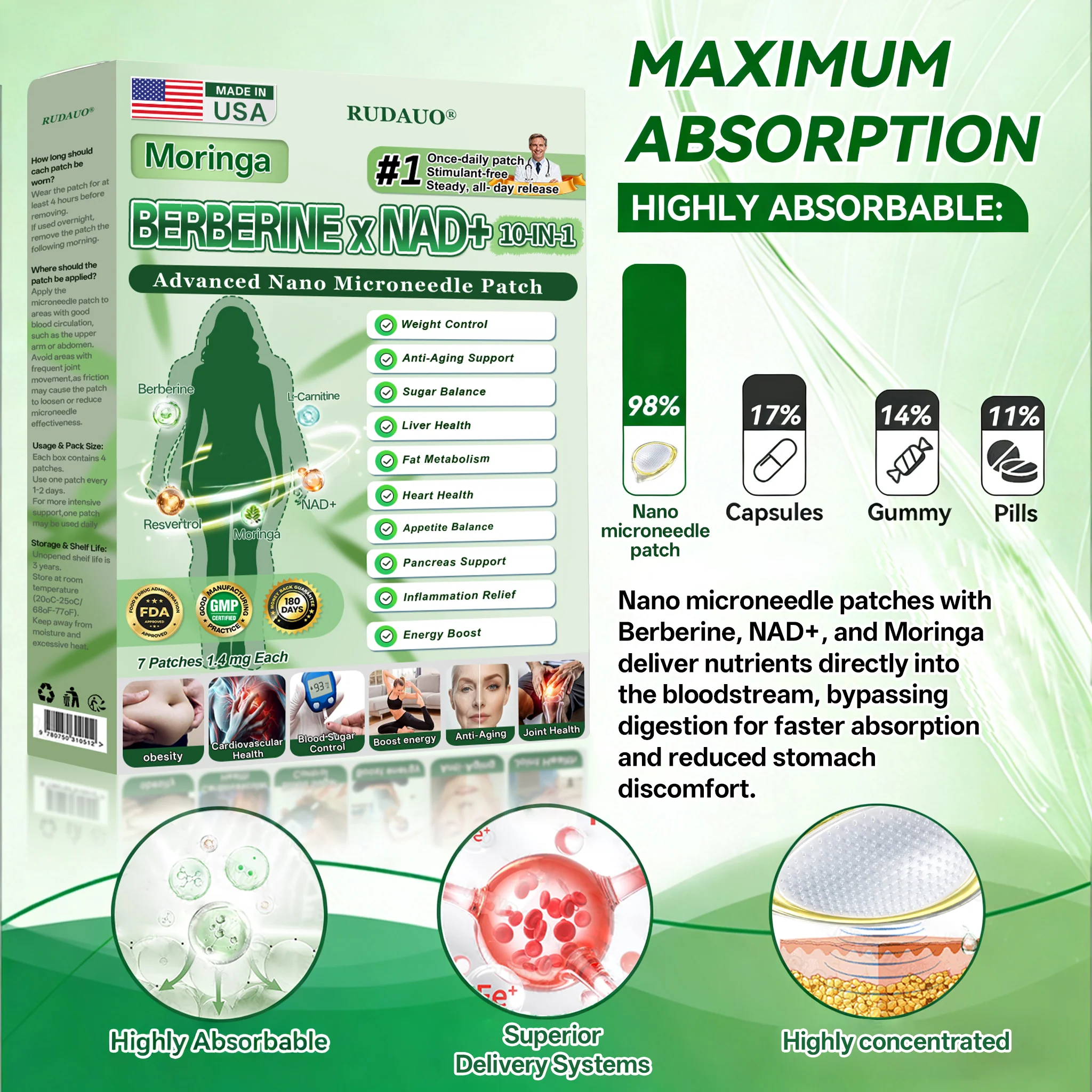 𝐑𝐔𝐃𝑨𝑼𝑶® 𝑴𝒐𝒓𝒊𝒏𝒈𝗮 · 𝗕𝗲𝗿𝗯𝗲𝗿𝙞𝙣𝙚 × 𝙉𝘼𝐃+ 𝟏𝟎-𝐢𝐧-𝟏 𝗔𝗱𝘃𝗮𝗻𝗰𝙚𝙙 𝙉𝙖𝙣𝙤 𝙈𝙞𝙘𝙧𝙤𝙣𝙚𝙚𝐝𝐥𝐞 𝐏𝐚𝐭𝙘𝙝: 98% Absorption Rate, Transforming Weight, Liver, Gut & Skin Health