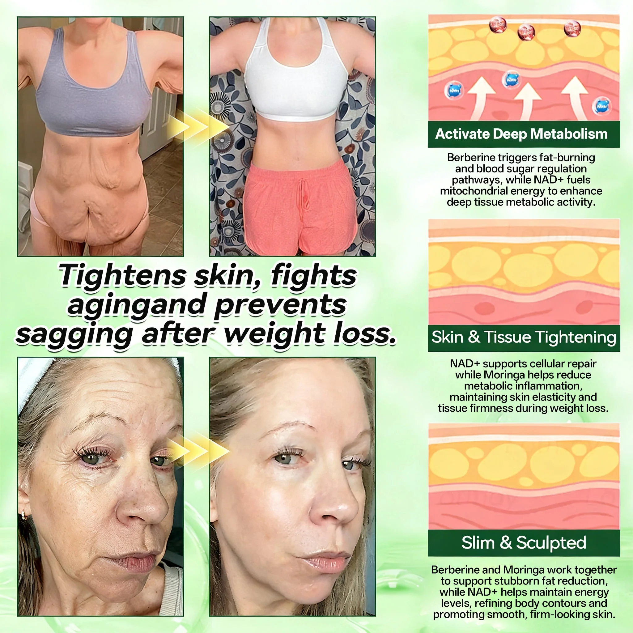 Benefits: Supports cellular energy levels and physical endurance, promotes cognitive function and mental focus, helps slow age-related cellular decline, and contributes to improved skin firmness and elasticity. Particularly beneficial for addressing skin laxity in areas such as the abdomen and arms following weight loss.