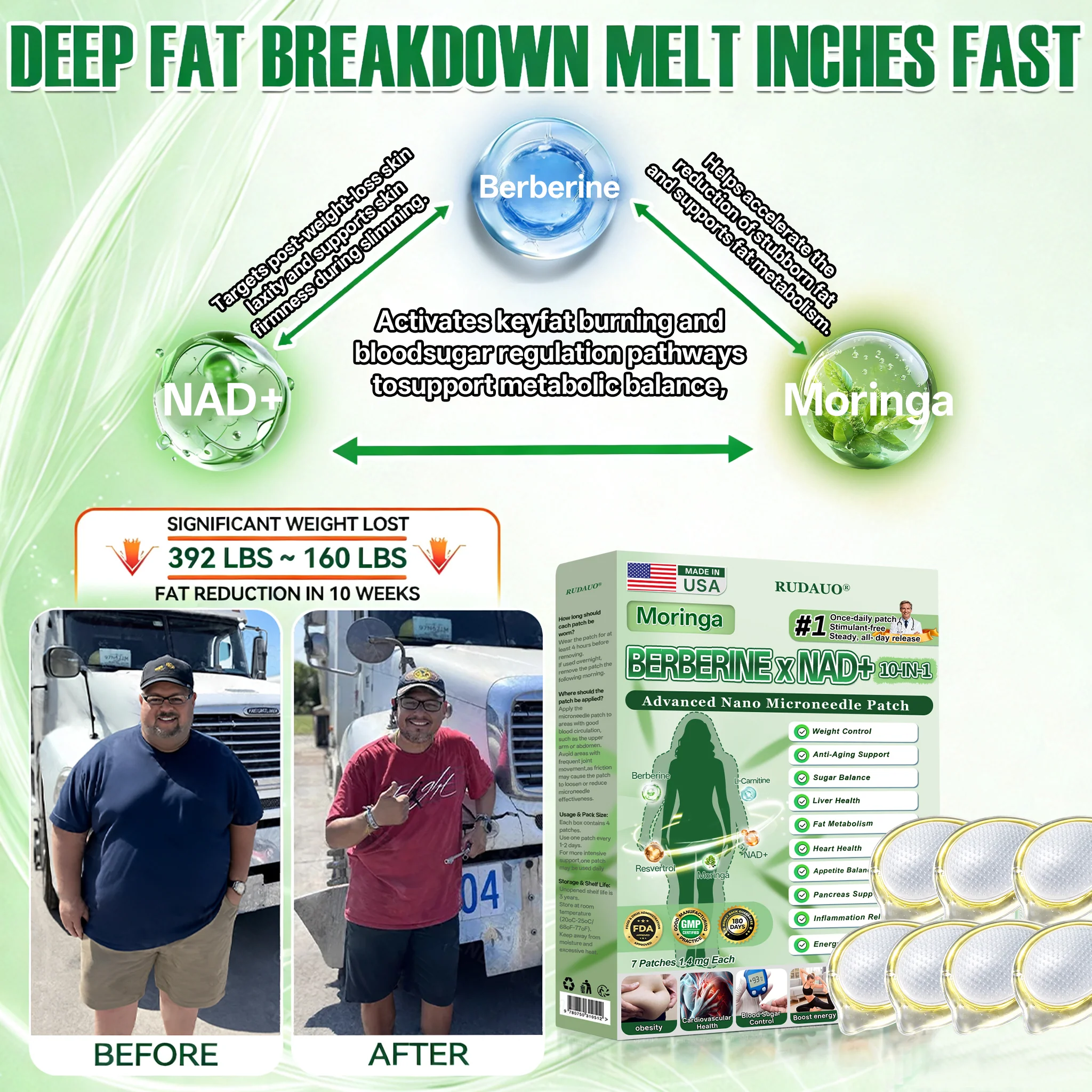 We are a top-tier endocrinology research team., and many of us have personally experienced obesity and its associated complications. Over the years, we have also evaluated commonly available weight-loss interventions on the market, including injectable therapies, capsules, and Oral weight-loss pills. However, their outcomes were often limited, and many were accompanied by tolerability concerns. These experiences motivated us to develop a safer, more natural, and more effective approach to metabolic health and weight management. After more than 12 years of research, our team initiated self-testing of this program, successfully overcoming the limitations of traditional single-pathway interventions that frequently cause gastrointestinal side effects. By adopting a dual-pathway strategy—supporting appetite regulation and fat metabolism while also addressing post-weight-loss skin firmness—we observed significant improvements in body weight and metabolic health, without rebound weight gain or adverse reactions. Subsequently, we conducted large-scale studies and clinical trials involving more than 5,000 participants, further validating the performance of 𝐑𝐔𝐃𝑨𝑼𝑶® 𝑴𝒐𝒓𝒊𝒏𝒈𝗮 · 𝗕𝗲𝗿𝗯𝗲𝗿𝙞𝙣𝙚 × 𝙉𝘼𝐃+ 𝟏𝟎-𝐢𝐧-𝟏 𝗔𝗱𝘃𝗮𝗻𝗰𝙚𝙙 𝙉𝙖𝙣𝙤 𝙈𝙞𝙘𝙧𝙤𝙣𝙚𝙚𝐝𝐥𝐞 𝐏𝐚𝐭𝙘𝙝 in metabolic regulation, appetite control, and overall health outcomes. These benefits were particularly pronounced among overweight or obese adults over the age of 40. Supported by contemporary medical research, 𝐑𝐔𝐃𝑨𝑼𝑶® 𝑴𝒐𝒓𝒊𝒏𝒈𝗮 · 𝗕𝗲𝗿𝗯𝗲𝗿𝙞𝙣𝙚 × 𝙉𝘼𝐃+ 𝟏𝟎-𝐢𝐧-𝟏 𝗔𝗱𝘃𝗮𝗻𝗰𝙚𝙙 𝙉𝙖𝙣𝙤 𝙈𝙞𝙘𝙧𝙤𝙣𝙚𝙚𝐝𝐥𝐞 𝐏𝐚𝐭𝙘𝙝 has undergone rigorous FDA regulatory review and evaluation, with its safety, effectiveness, and compliance formally recognized. This formulation represents a scientific advancement beyond conventional weight-loss products that are often associated with significant gastrointestinal burden, offering a natural, safe, and effective option for individuals seeking comprehensive metabolic support and sustainable long-term weight management.”